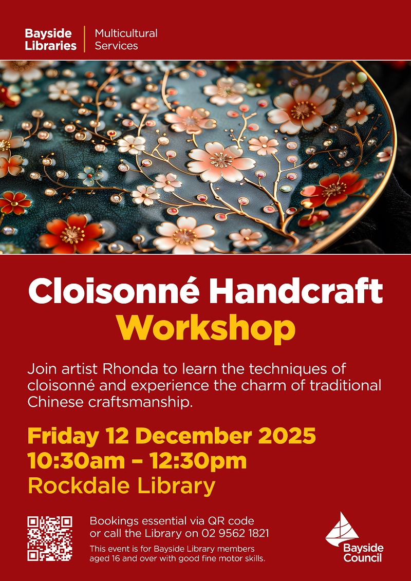 時間: 每月第二個星期五 早上十點半至中午十二點半 地點: 請留意海報上列明每次活動的舉辦地點 每次活動開始前兩週上午 10:30 開放線上預約。文化手工藝工作坊僅限 Bayside 圖書館會員參加 必需在線預約或掃描海報二維碼, 預約網址 https://baysidelibrary.eventbrite.com 需要幫助和諮詢, 請致電圖書館,電話 02 9562 1821